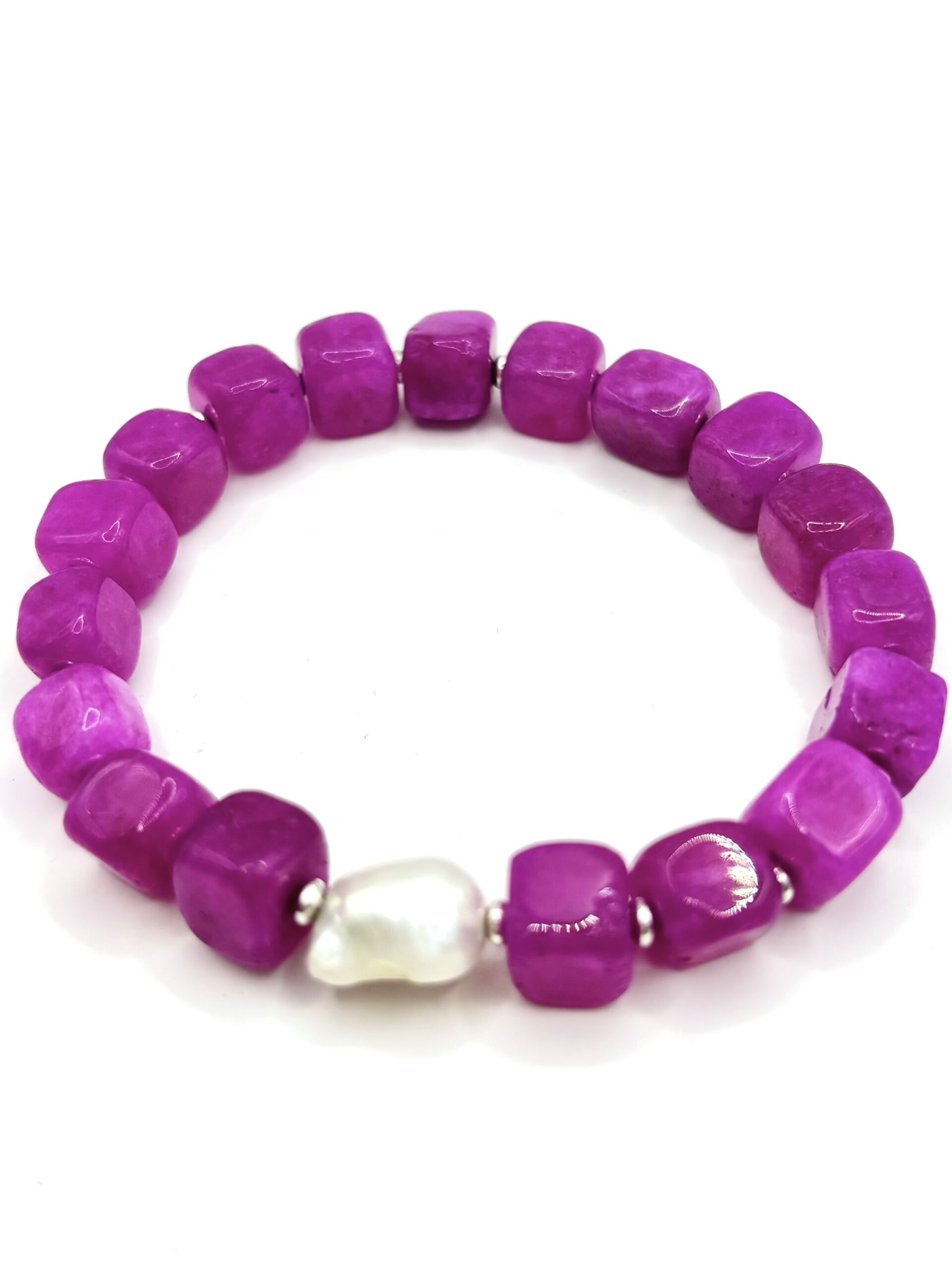 Wyrazista i elegancka bransoletka wykonana z naturalnych kamieni w intensywnym, fuksjowym odcieniu, które przyciągają uwagę swoją formą i kolorem. Kamienie w kształcie sześcianów o wielkości ok. 5 mm nadają biżuterii nowoczesnego i geometrycznego charakteru.