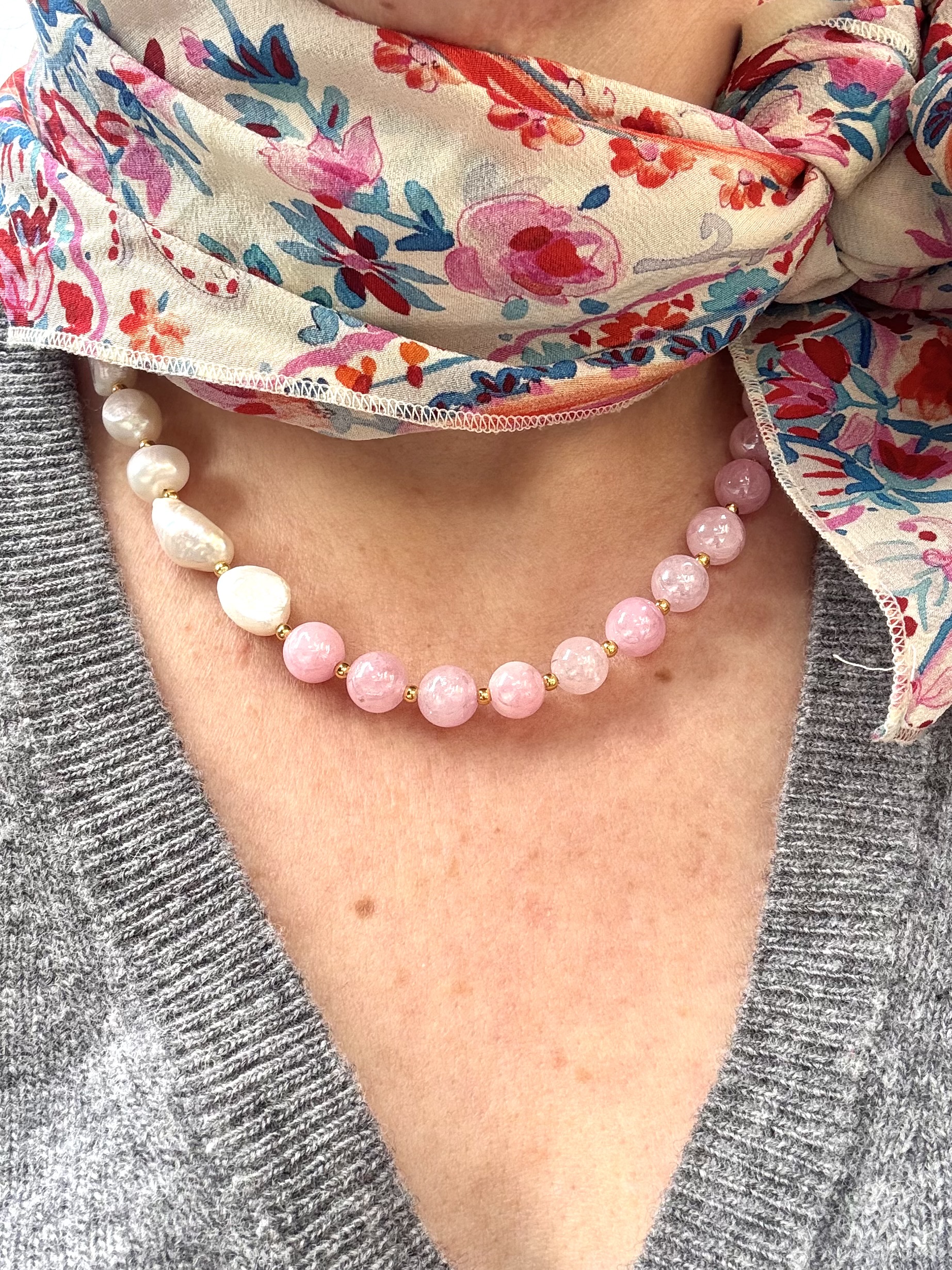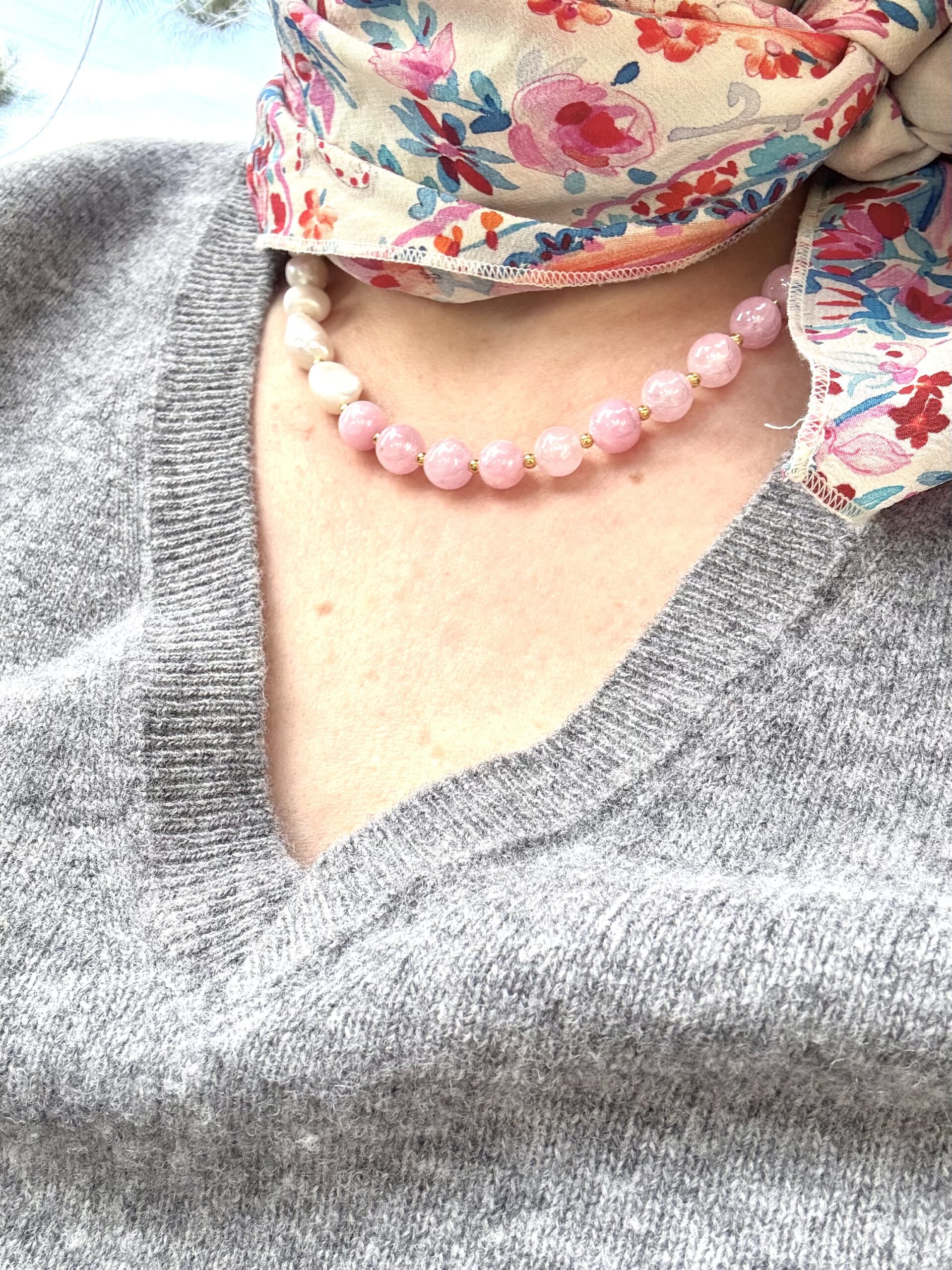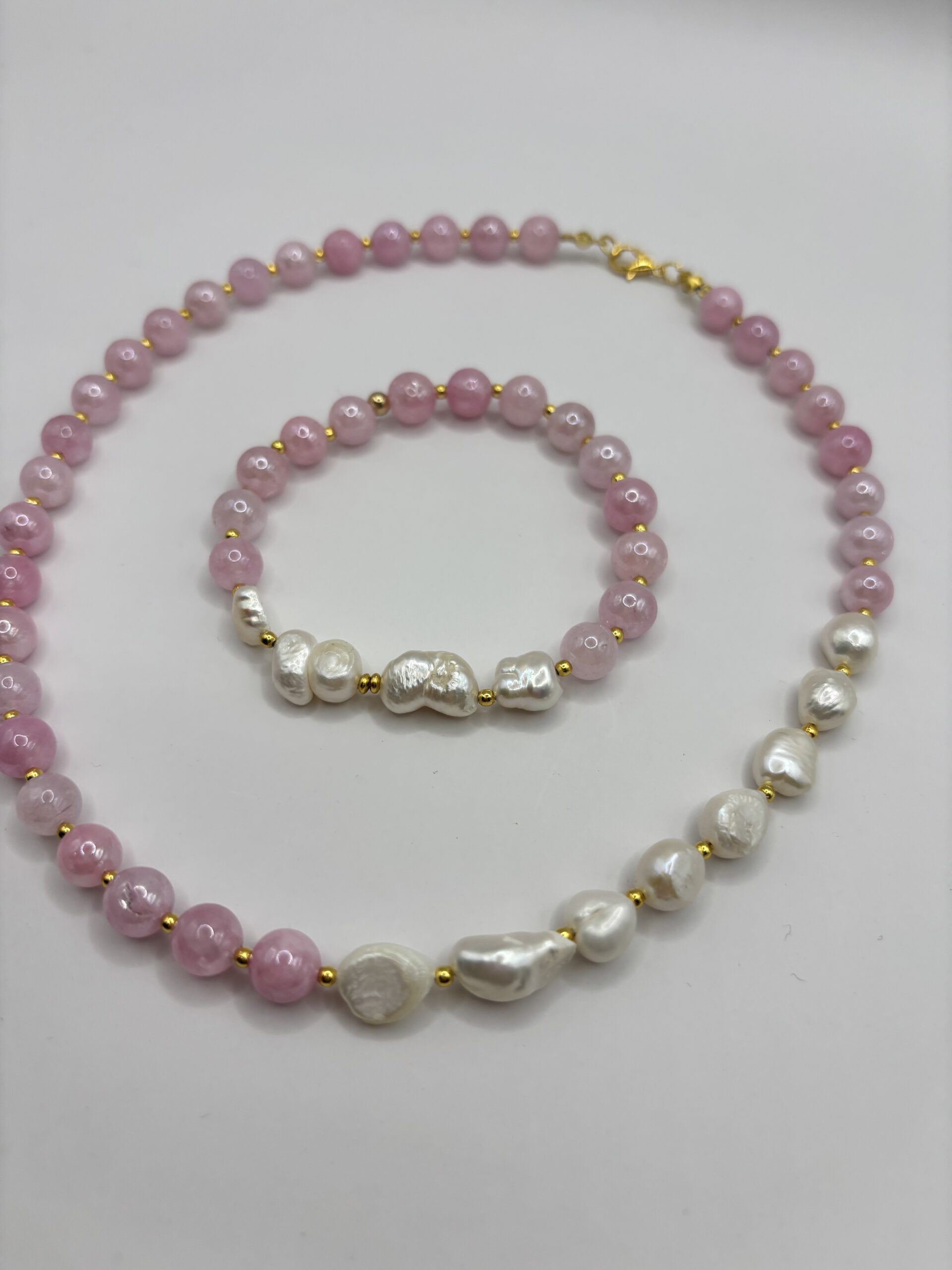Kamienie o miękkim, różowym odcieniu pięknie współgrają z perłami, podkreślając ich naturalny blask. Całość została przeplatana złotymi przekładkami, które dodają biżuterii lekkości i subtelnego połysku.