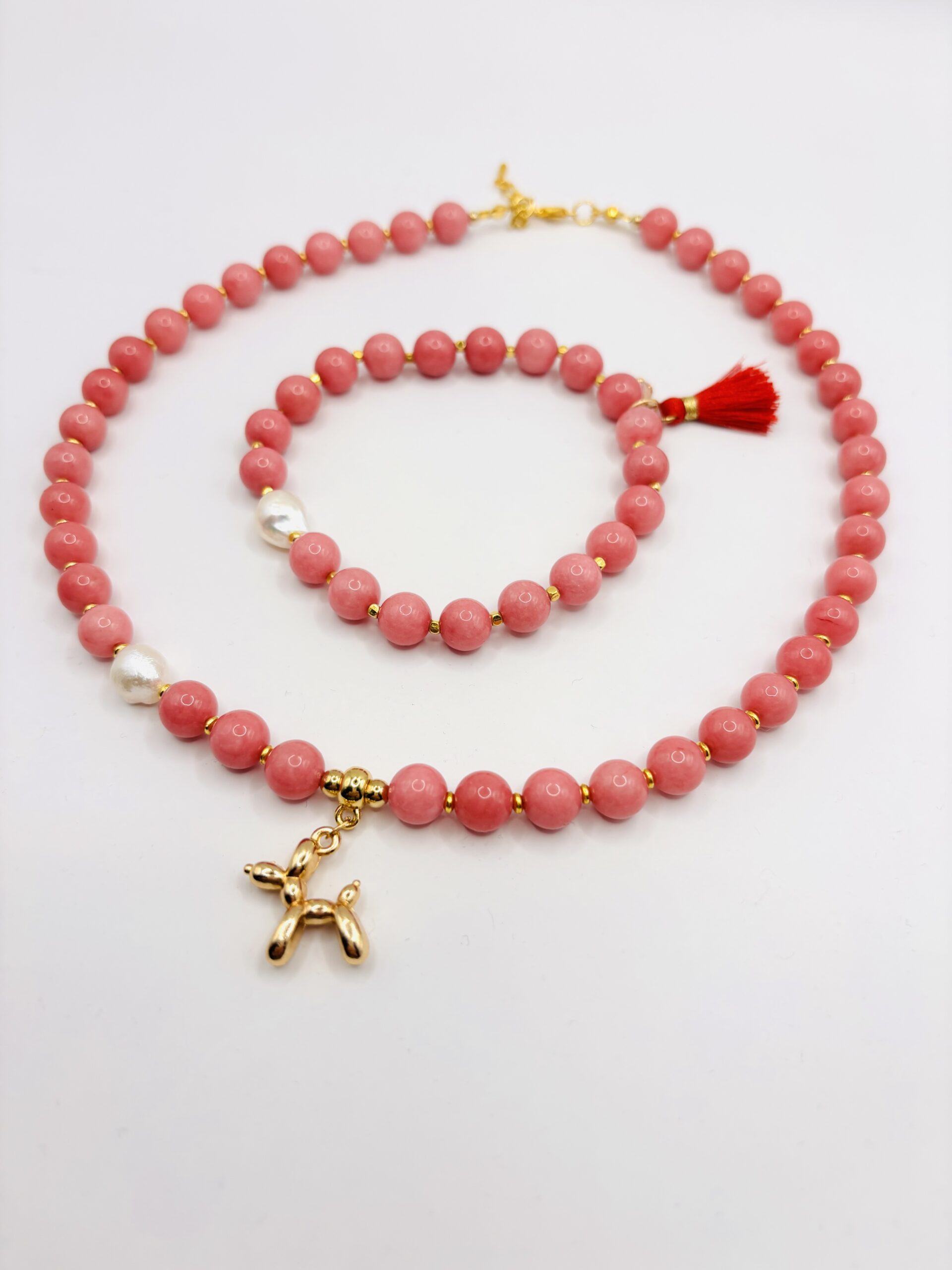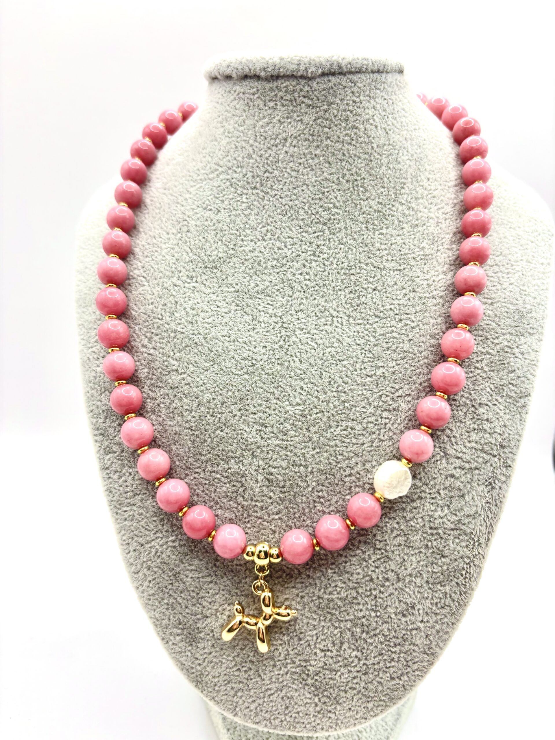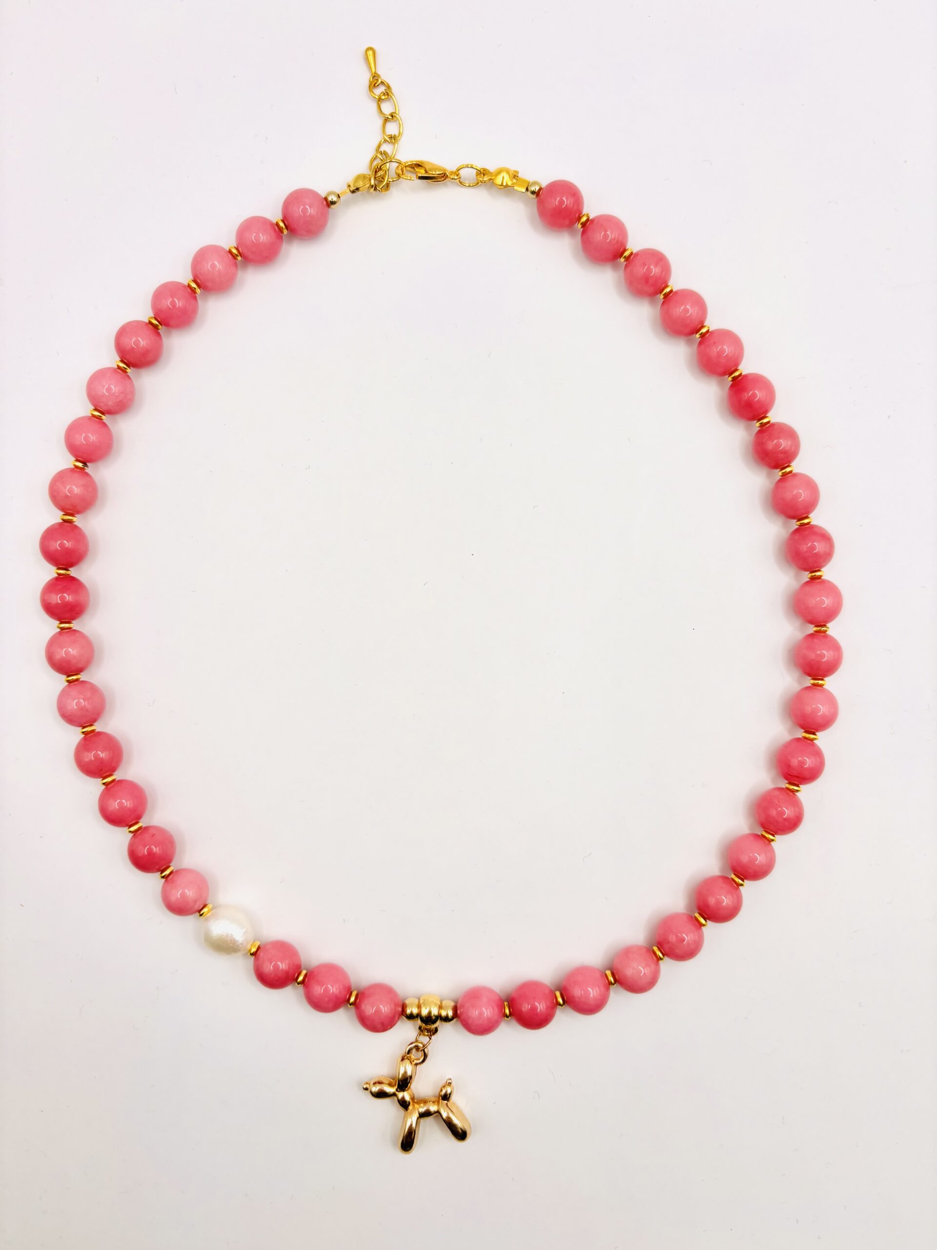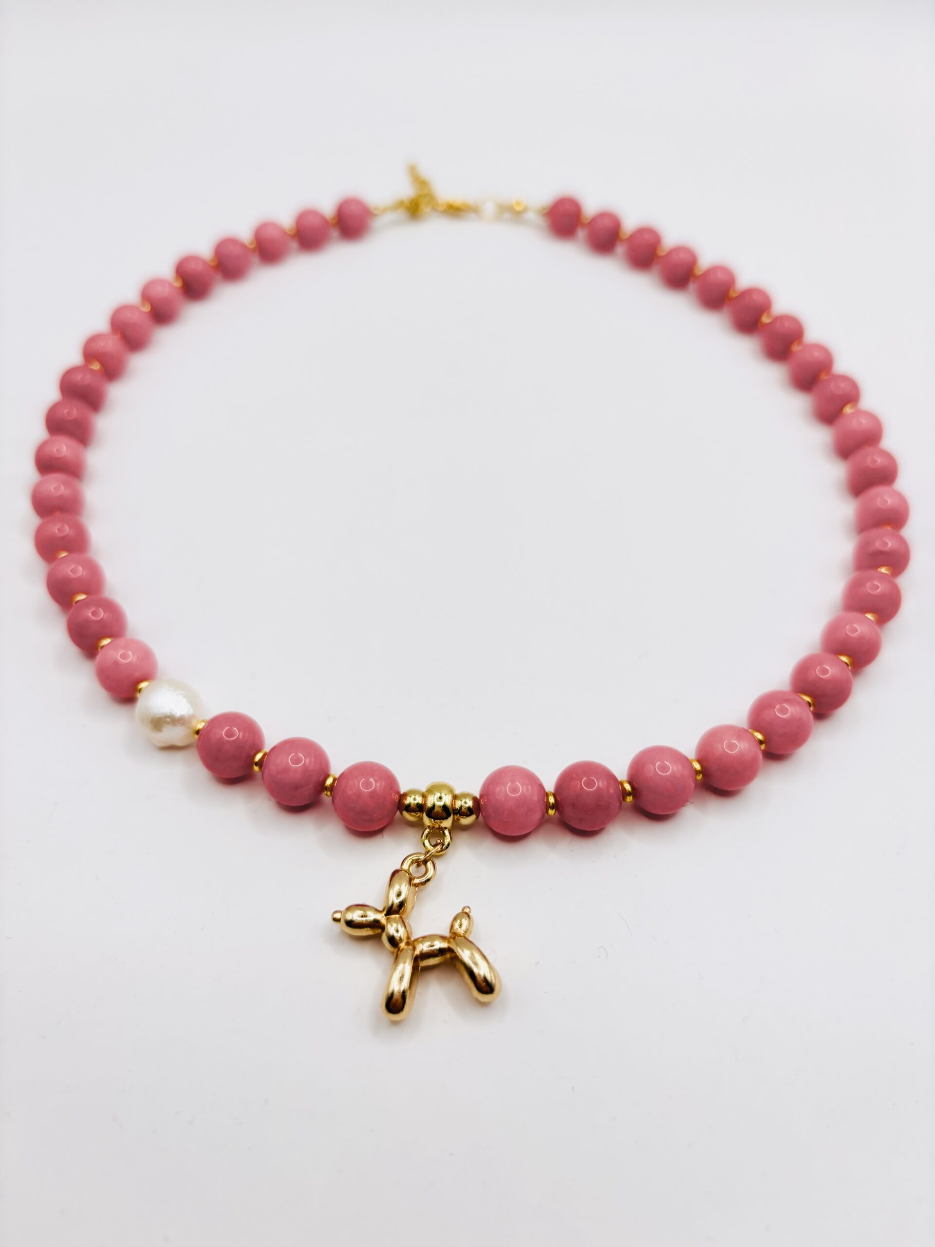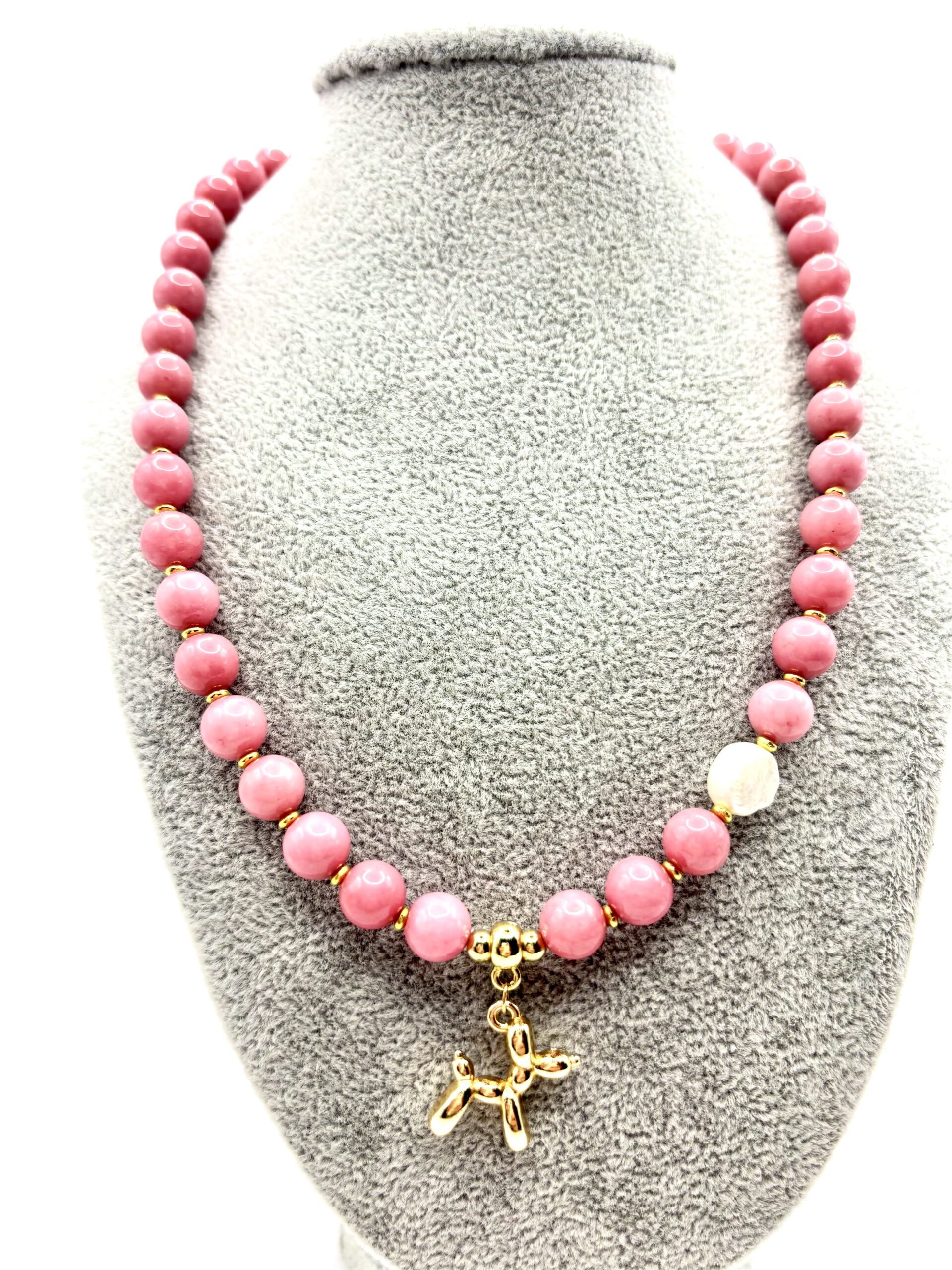 Naszyjnik z różowych kamieni naturalnych z zawieszką pieska