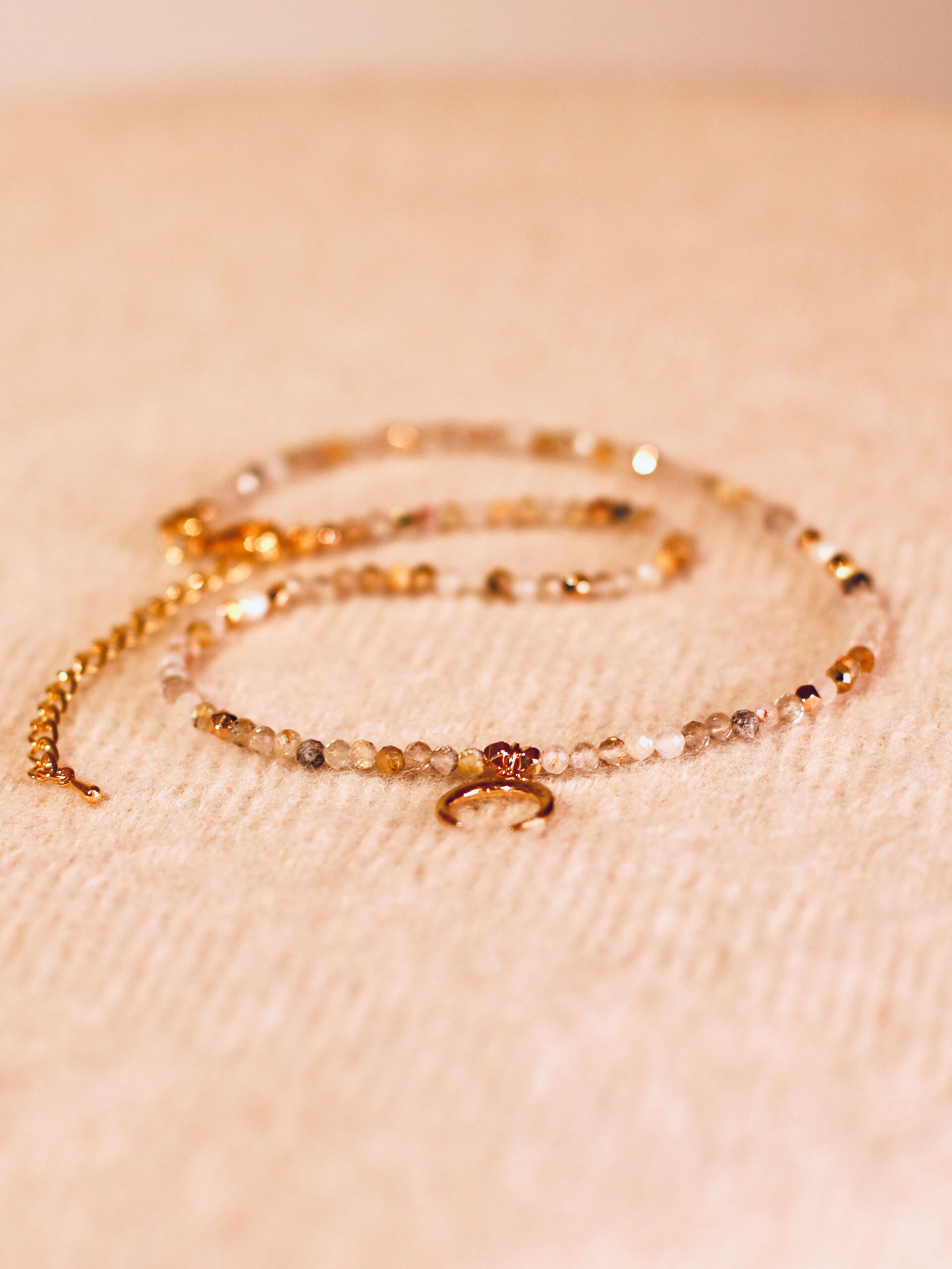 Wyjątkowy naszyjnik stworzony z naturalnych kamieni cytrynu o ciepłej, świetlistej barwie. Kamienie o wielkości 3 mm, z delikatnie nieregularną strukturą, podkreślają ich autentyczność i naturalne piękno.