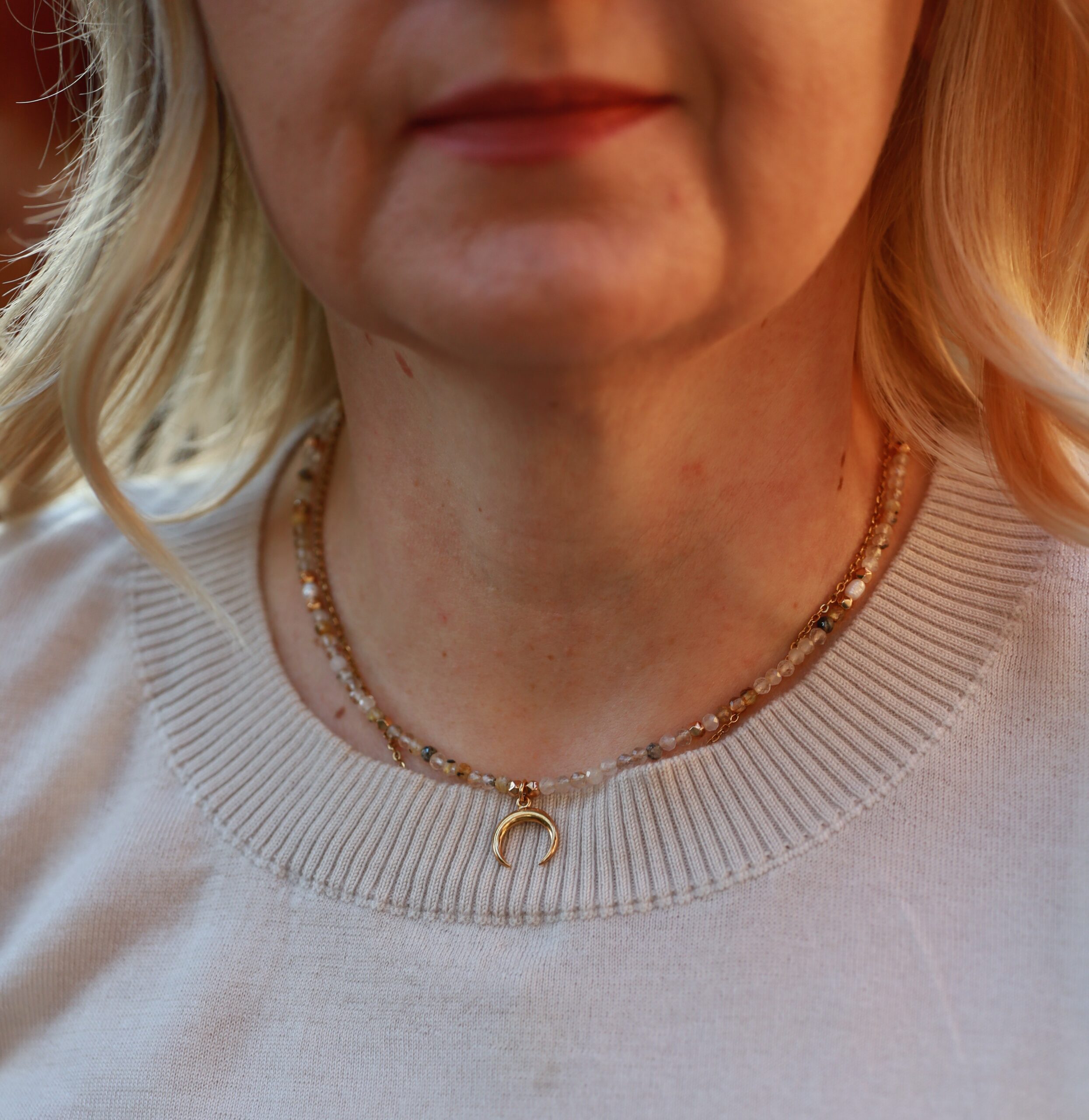 Zapięcie wykonane ze srebra pozłacane stanowi luksusowe wykończenie, a zawieszka w formie księżyca nadaje biżuterii delikatny, symboliczny charakter i podkreśla wyjątkowość projektu.