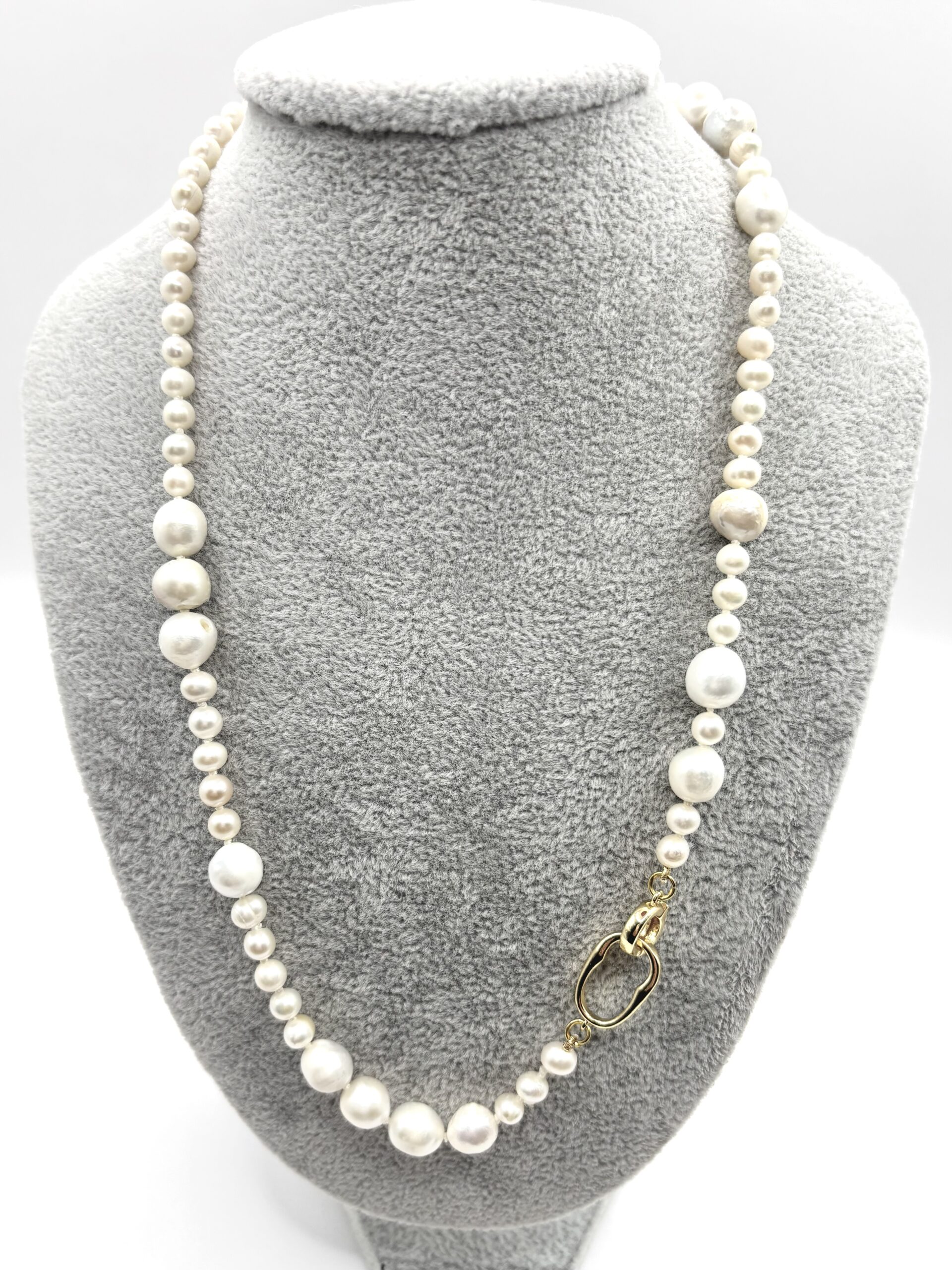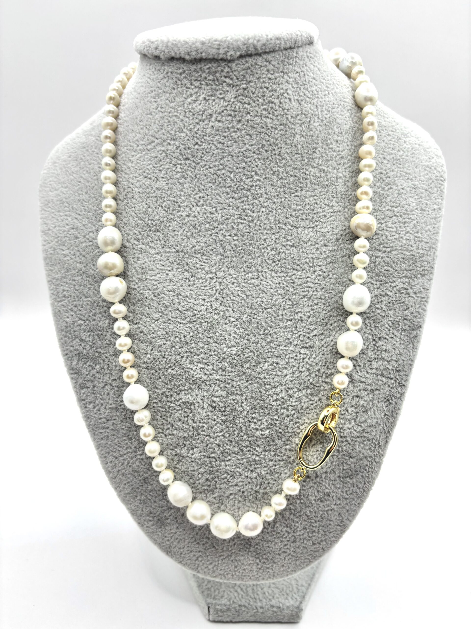 Wyjątkowy naszyjnik stworzony z kremowo-białych, naturalnych pereł o nieregularnej strukturze, które podkreślają ich autentyczne piękno i unikalny charakter. Połączenie pereł w rozmiarach 3–4 mm i 8 mm, starannie supełkowanych na jedwabnych, nylonowych nici, tworzy harmonijną kompozycję pełną lekkości i subtelnej elegancji.